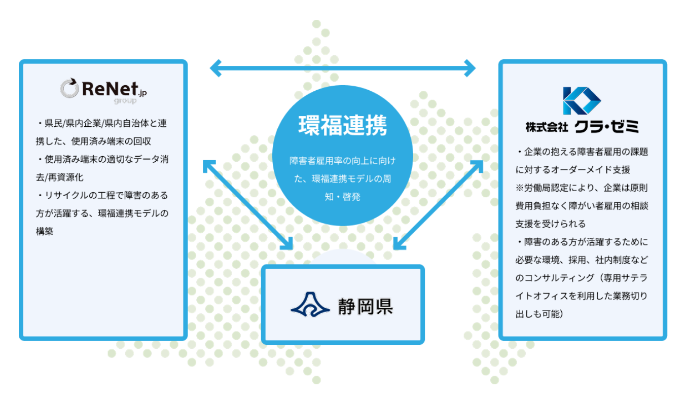 先月10月6日に、静岡県・リネットジャパン・当社の3者により締結した、県内の使用済みパソコンのリサイクル(環境)と障がい者雇用の創出(福祉)を連携する『環福連携協定』。このたび設立した『静岡環福連携促進協議会』は、この『環福連携協定』の理念を県内企業へと広げ、実効性のあるムーブメントに発展させるための推進母体です。