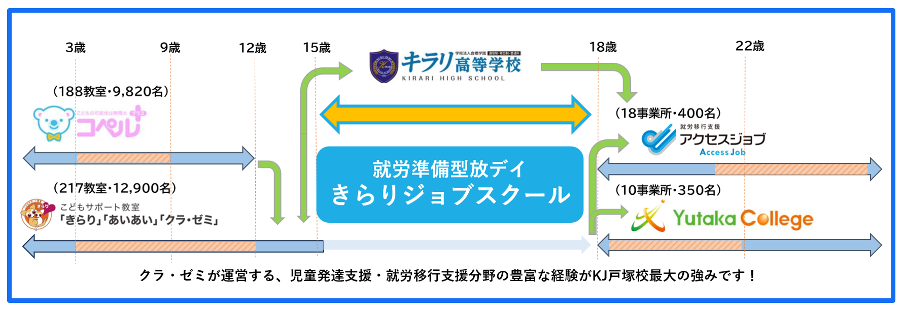 KJ戸塚校は、当社が展開する福祉事業の「高校生年代への支援のすき間」を埋めるための新たな拠点とも言えます。幼児期・学童期を支える「児童発達支援事業(こどもサポート教室・コペルプラス)」の延長上に、高校生年代を対象とした当事業所を開校することで、社会に出るための準備を支援します。卒業後は就業、もしくは当社が運営する18歳以上を対象とした「福祉型カレッジ(ゆたかカレッジ)」、および成人向けの「就労移行支援事業所(アクセスジョブ)」へとスムーズに各支援を線としてつなぎ、障がいのあるご利用者様が安心して成長できる環境をライフステージを通して継続的に提供し、将来的な就労定着を実現します。詳しくは、添付のPDFもしくは以下URLより、プレスリリースをご確認ください。